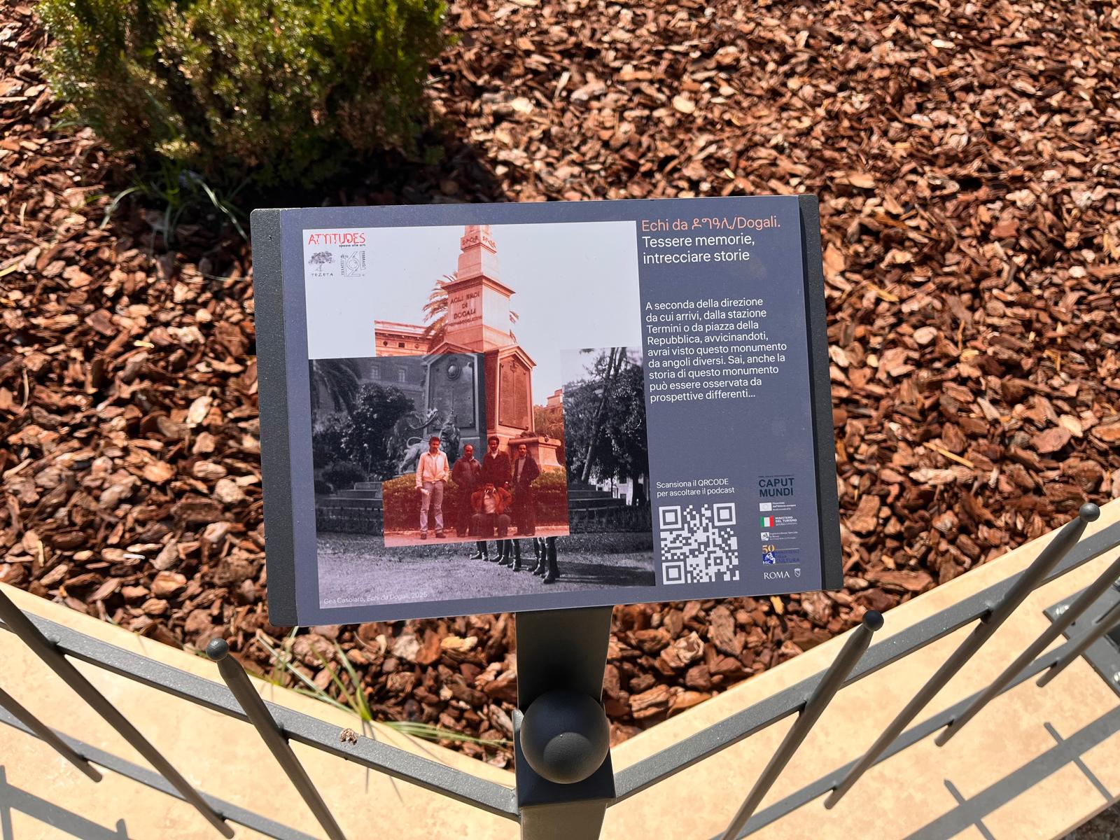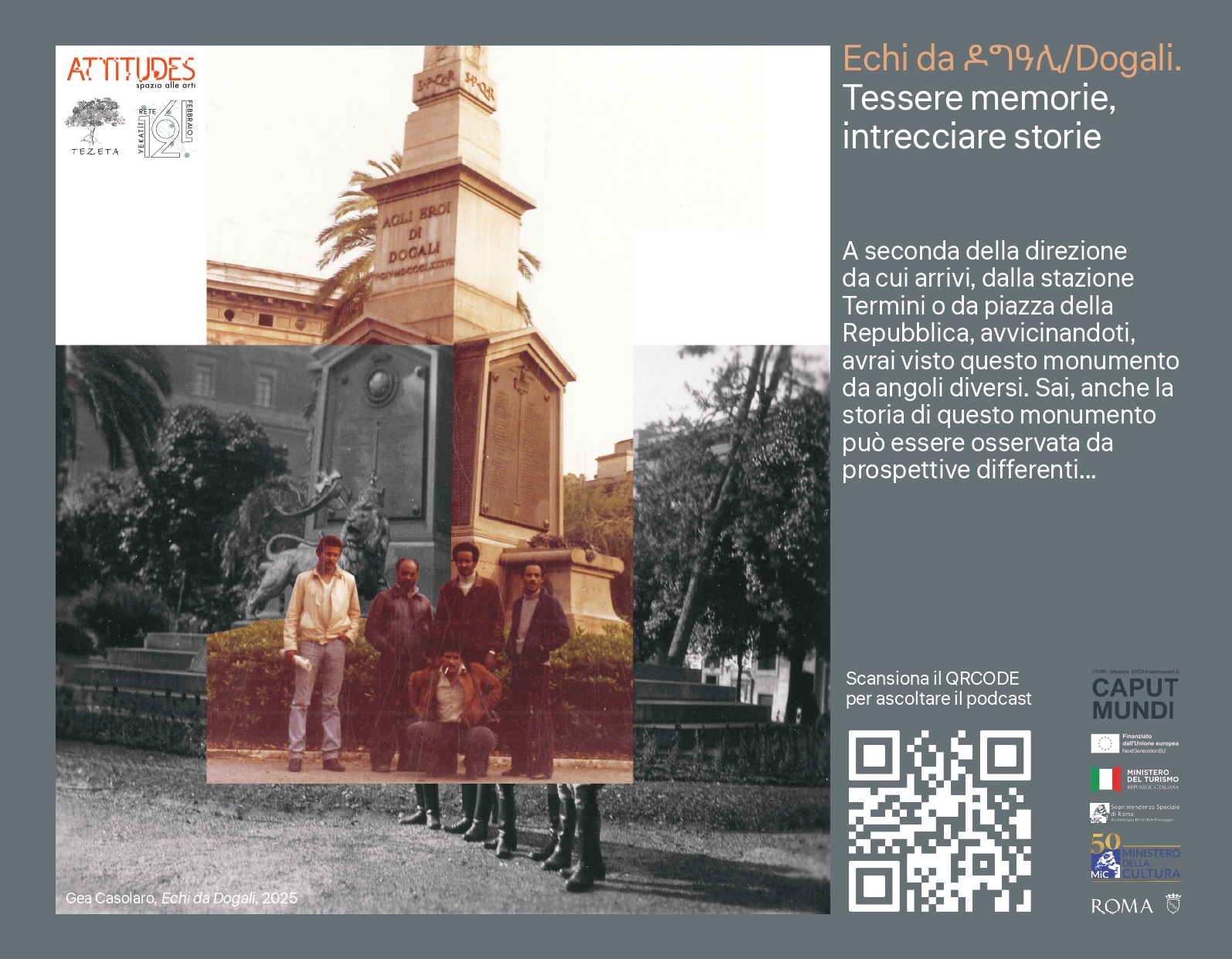 L’idea del progetto di risignificazione è legata al restauro del Monumento ai caduti di Dogali nel 2025: un intervento manutentivo che appare pensato unicamente in una logica conservativa, mirata a restituire l’aspetto originario del monumento senza mettere in discussione il modo in cui esso trasmette il passato coloniale del nostro Paese, con il rischio di celebrarlo acriticamente, e di continuare a invisibilizzare la resistenza anticoloniale che vinse quella battaglia, sconfiggendo l’esercito italiano. Per evitare una problematica operazione di puro ripristino dell’obelisco e del suo significato, Attitudes_spazio alle arti e Tezeta hanno pensato un intervento parallelo al restauro che potesse raccontarne la storia in prospettive diverse da quella ufficiale ottocentesca, coinvolgendo in particolare le persone della diaspora, le persone eritree, le attiviste e gli attivisti anticoloniali della città. Questa idea è nata nell’ambito delle attività che le nostre due associazioni stanno portando avanti da diversi anni sulla rilettura delle tracce materiali e immateriali del colonialismo negli spazi pubblici. Da quattro anni ci siamo connesse ad altre associazioni, ricercatrici/ricercatori e cittadin*, attivi su tutto il territorio nazionale, nella Rete Yekatit12-19febbraio. Nella città di Roma abbiamo lavorato in collaborazione con l’Assessorato alla cultura e con la Commissione toponomastica del Comune, modificando circa 25 didascalie di odonimi coloniali, realizzando passeggiate decoloniali nei quartieri interessati da odonimi coloniali ed eventi pubblici di divulgazione sulla storia coloniale e le sue eredità problematiche nel presente. Un progetto tuttora in corso, che ogni anno propone un ricco calendario di azioni ed eventi.